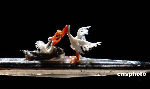 圖為臺灣著名微雕家陳逢顯的新作“母愛真情”。放在針孔上,只有小沙粒那么大。陳逢顯說,這是他應大陸微雕界人士的邀約,為慰問汶川大地震受災同胞而作。中新社發(fā) 陳立宇 攝