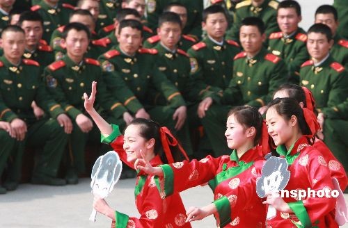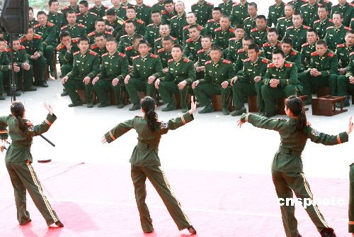2月22日,武警江蘇總隊文工團演員為蘇州武警官兵表演舞蹈。當日,武警江蘇總隊政治部文工團組織“慰問抗雪救災(zāi)一線官兵及新戰(zhàn)友專場文藝巡演”之首場演出活動,在蘇州武警支隊新兵營訓(xùn)練場熱鬧開演。中新社發(fā) 蘇秀 攝