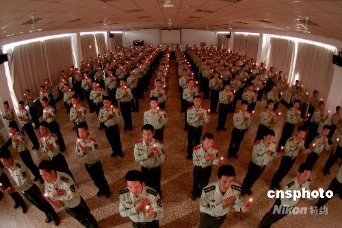 5月14日,武警河北總隊石家莊市支隊機動大隊的官兵們,點燃手中的蠟燭,唱響“祝你平安”、“讓世界充滿愛”等歌曲,為在四川汶川等地地震災害中受災的同胞祈福。中新社發(fā) 余洪恩 攝