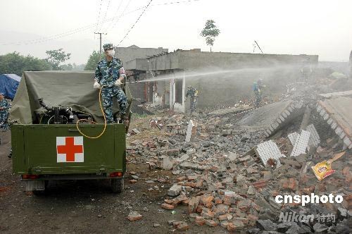 5月下旬,海軍衛(wèi)生防疫消殺突擊分隊(duì)的防疫車對(duì)四川地震災(zāi)區(qū)民房進(jìn)行預(yù)防性消毒。截至到5月30日上午,由86名專業(yè)隊(duì)員組成的衛(wèi)生防疫消殺突擊分隊(duì)已完成對(duì)四川綿竹、什邡等地震重災(zāi)區(qū)60多個(gè)市區(qū)街道、村莊的廢墟、房舍、疑似疫源地等場(chǎng)所進(jìn)行衛(wèi)生防疫和消毒殺菌,有效地控制了災(zāi)區(qū)的疫情隱患。中新社發(fā) 李唐 攝
