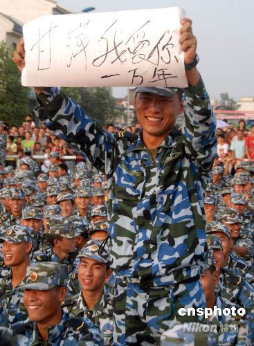 6月1日傍晚,海政文工團著名演員宋祖英、呂繼宏、甘萍、呂薇、閆學(xué)晶、霍勇、姚貝娜等來到四川什邡市師古鎮(zhèn),慰問奮戰(zhàn)在抗震救災(zāi)一線的海軍陸戰(zhàn)隊的勇士們。演員們的出現(xiàn),讓奮戰(zhàn)了半個月的官兵們心情頓時開朗,露出久違的笑容。中新社發(fā) 姚澤勇 攝