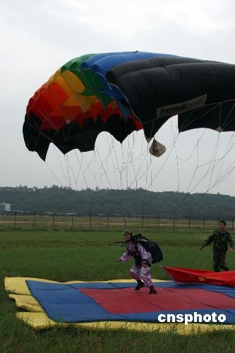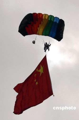 11月初,第七屆中國(guó)國(guó)際航空航天博覽會(huì)上,中國(guó)空軍跳傘運(yùn)動(dòng)大隊(duì)的27名隊(duì)員先后進(jìn)行了跳傘表演,其中的喜從天降、航空盛典、東方之珠、金龍飛舞、空中彩虹等精彩課目。圖為空軍跳傘運(yùn)動(dòng)大隊(duì)隊(duì)員肖茜蓉帶著鮮艷的五星紅旗第一個(gè)從天而降。中新社發(fā) 譚超 攝