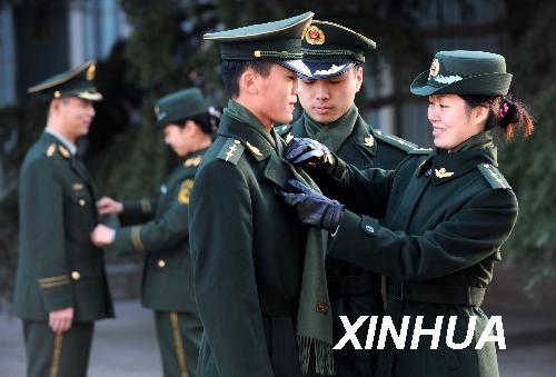 11月10日,青島公安邊防支隊(duì)官兵正在試穿07式冬季軍服。當(dāng)日,武警山東總隊(duì)、山東公安邊防總隊(duì)開(kāi)始換發(fā)武警07式冬季軍服。新款冬裝分為冬常服、常服大衣和制式毛衣,均為深橄欖綠色,冬常服由關(guān)領(lǐng)改為開(kāi)領(lǐng),毛上衣可佩戴肩章作外衣穿著,軍官常服大衣可佩戴圍巾。新華社記者 李紫恒攝