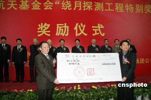 十二月三日,中國航天基金會秘書長霍廣耀(左)向國防科工委月球探測工程中心主任胡浩頒發(fā)“繞月探測工程特別獎”,獎金總額八百四十萬元人民幣,獎勵參加繞月探測工程研制、生產(chǎn)、發(fā)射、測控和應(yīng)用等任務(wù)中有突出貢獻的單位與個人。中新社發(fā) 孫自法 攝