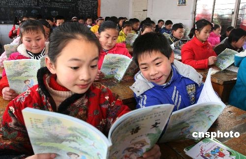 2月20日,六安市金安區(qū)人民路小學五年級學生在閱讀新課本。當日,在經(jīng)受50年不遇暴雪災害的大別山老區(qū)安徽省六安市,各中小學校的學生們領到新課本,如期開學上課。雪災發(fā)生后,當?shù)攸h委、政府采取多種措積極施維修雪毀校舍,嚴格執(zhí)行收費政策,免去城區(qū)學生的學雜費和部分下崗特困戶子女的課本作業(yè)費,農(nóng)村學生費用全免,保障災后教學工作正常進行。中新社發(fā) 陳超平 攝