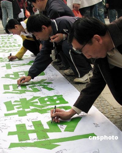 圖:北京大學(xué)生參加綠色奧運簽名活動