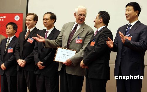 四月九日,全球500強、世界領(lǐng)先的多元化高科技制造企業(yè)霍尼韋爾公司攜手北京航空航天大學(xué),共同拉開2008年霍尼韋爾—諾貝爾全球校園行的序幕。諾貝爾物理獎獲得者謝爾登·格拉肖博士(右三)親臨現(xiàn)場為學(xué)子們講授了他的學(xué)術(shù)成果和科研心得,與學(xué)生們進(jìn)行了面對面的交流;裟犴f爾—諾貝爾全球校園行活動由霍尼韋爾公司發(fā)起,旨在全球范圍內(nèi)提升高?茖W(xué)教育、培養(yǎng)高素質(zhì)科技創(chuàng)新人才的社會公益活動。中新社發(fā) 任海霞 攝