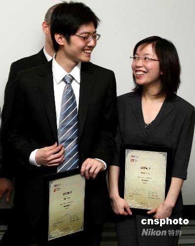 5月7日,清華大學(xué)“清華-杜孟傳播獎學(xué)金”頒獎典禮上,獲得此項獎勵“最佳創(chuàng)意獎”的清華學(xué)生侯青楊(右)、“優(yōu)秀策劃案獎”得主張棟同學(xué),分別獲得赴瑞士日內(nèi)瓦和泰國曼谷的聯(lián)合國愛滋病規(guī)劃署實習(xí)3個月的機會。這兩位清華學(xué)生將與世界各地專業(yè)人士一起為解決世界和中國可能發(fā)生的由愛滋病引起的嚴(yán)重健康危機而工作。中新社發(fā) 宋吉河 攝