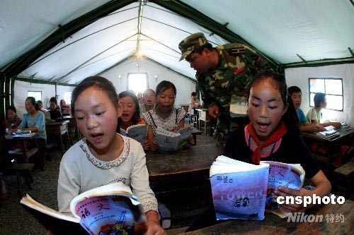 成都軍區(qū)駐渝某集團(tuán)軍官兵步行100余公里進(jìn)入茂縣后,進(jìn)村入戶組得知受5月12日地震的破壞,四川省茂縣宗渠村小的教學(xué)樓、住宿樓倒塌。學(xué)校的302名學(xué)生被迫停課。他們立即組織官兵搭制帳篷小學(xué),逐家逐戶走訪并告訴家長讓學(xué)生到帳篷小學(xué)上課,5月24日上午10時(shí),在帳篷小學(xué)校長、駐渝某團(tuán)代副團(tuán)長嚴(yán)奎的宣布下,茂縣首座帳篷小學(xué)開課。中新社發(fā) 高效文 攝