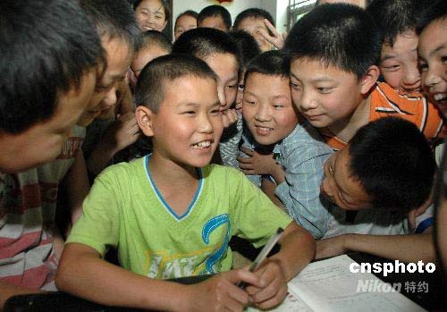 5月25日,來自四川綿陽市火炬實驗小學學生藍宇高興地開始了在河北省新樂市孝德小學的學習生活。地震發(fā)生后,藍宇來到新樂市赤垢村的姨媽家。經(jīng)聯(lián)系,孝德小學校領導高度重視,決定收留藍宇,免除其全部費用,并提供藍宇的生活費用。中新社發(fā) 賈敏杰 攝