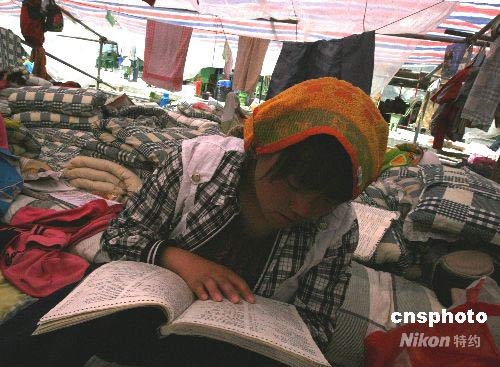 一位四川茂縣地震災(zāi)區(qū)的女學(xué)生抓緊白天時(shí)光學(xué)習(xí)功課。汶川大地震造成茂縣災(zāi)區(qū)至今電力完全中斷,道路危險(xiǎn)艱難,該縣民族中學(xué)全成危房,600多名學(xué)生在廣場(chǎng)簡(jiǎn)易帳篷里學(xué)習(xí)生活。中新社發(fā) 賈國(guó)榮 攝