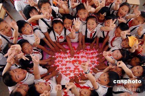 2008年5月30日,來(lái)自四川綿陽(yáng)地震災(zāi)區(qū)、在日照市經(jīng)濟(jì)開(kāi)發(fā)區(qū)第二小學(xué)上學(xué)的3名學(xué)生,在新學(xué)校與老師同學(xué)們歡慶“六一”兒童節(jié)。日照經(jīng)濟(jì)開(kāi)發(fā)區(qū)第二小學(xué)的師生為3名同學(xué)送上精美禮物,祝福他們和四川地震災(zāi)區(qū)的小朋友節(jié)日快樂(lè)。近日,山東日照市教育部門安排3名投奔親友的四川地震災(zāi)區(qū)小學(xué)生就近在日照經(jīng)濟(jì)開(kāi)發(fā)區(qū)二小上學(xué),學(xué)校為這3名學(xué)生捐贈(zèng)了學(xué)習(xí)用品,并減免費(fèi)用。中新社發(fā) 陳為峰 攝