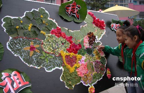 9月27日,山東省棗莊市市中區(qū)回民小學(xué)開展“我為祖國(guó)增紅添綠”創(chuàng)意活動(dòng),學(xué)生們巧妙地運(yùn)用各種樹葉和鮮花制作出“中國(guó)地圖”,表達(dá)對(duì)偉大祖國(guó)的美好祝福,迎接國(guó)慶佳節(jié)。中新社發(fā) 吉 喆 攝