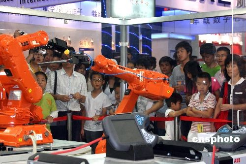 第十屆中國國際高新技術成果交易會10月12日在深圳正式開館迎客。在上屆首次設立機器人展備受追捧的基礎上,本屆高交會機器人專展在展出規(guī)模和層次上又有提高,以工業(yè)機器人、民生機器人、特種機器人、青少年機器人等多部分展示來自兩岸三地,以及日本等國的中外著名大學、研究機構、高科技企業(yè)在該領域的成果。圖為兩臺六軸機器人在乒乓球上表演寫字“手藝”,吸引著觀眾。中新社發(fā) 凌風 攝