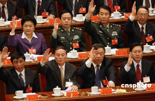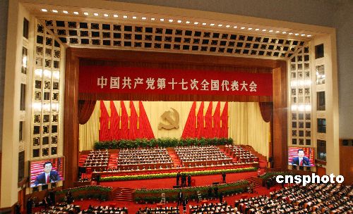 中國(guó)共產(chǎn)黨第十七次全國(guó)代表大會(huì)10月21日上午在北京人民大會(huì)堂閉幕。大會(huì)在選舉產(chǎn)生新一屆中央委員會(huì)和中央紀(jì)律檢查委員會(huì)后,以舉手表決的方式通過(guò)關(guān)于十六屆中央委員會(huì)報(bào)告的決議、關(guān)于中央紀(jì)律檢查委員會(huì)工作報(bào)告的決議、關(guān)于《中國(guó)共產(chǎn)黨章程(修正案)》的決議。中新社發(fā) 任晨鳴 攝