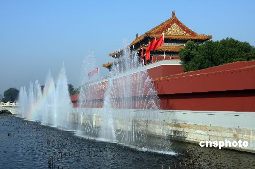 10月21日,北京天安門噴泉水池映彩虹。當(dāng)日,中共十七大在北京人民大會堂閉幕。中新社發(fā) 鄭雄增 攝