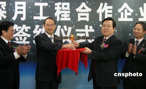 十月十九日,備受矚目的中國(guó)探月工程在北京簽署首家合作企業(yè),中國(guó)國(guó)防科學(xué)技術(shù)工業(yè)委員會(huì)協(xié)作配套中心與湘電集團(tuán)有限公司簽署合作協(xié)議,共同對(duì)中國(guó)探月工程品牌進(jìn)行市場(chǎng)開發(fā)和推廣。圖為國(guó)防科工委秘書長(zhǎng)黃強(qiáng)(左二)出席簽約儀式,并向中國(guó)探月工程首家合作企業(yè)贈(zèng)送“嫦娥一號(hào)”衛(wèi)星模型。中新社發(fā) 孫自法 攝