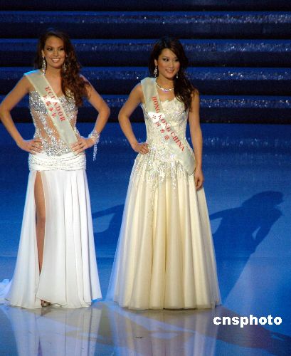 十二月一日,第五十七屆世界小姐總決賽晚會(huì)在三亞“美麗之冠”舉行,共有一百零六名來(lái)自世界各地的選手參加。圖右為香港小姐Ka Yi CHEUNG入選第十六位。中新社發(fā) 王辛莉 攝