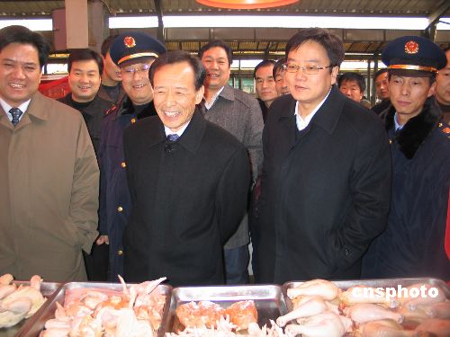 十二月二十八日,全國(guó)產(chǎn)品質(zhì)量和食品安全專(zhuān)項(xiàng)整治行動(dòng)驗(yàn)收組在西安抽查。圖為國(guó)家質(zhì)檢總局副局長(zhǎng)蒲長(zhǎng)城(前排左二)檢查0六七綜合市場(chǎng),與攤販笑談雞肉價(jià)格。中新社發(fā) 冽瑋 攝