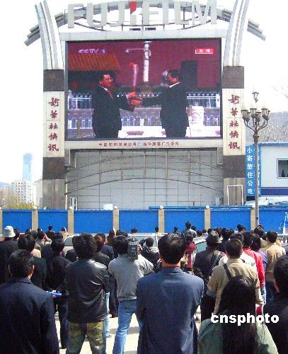 3月31日,北京站旅客在廣場大屏幕前觀看奧運圣火傳遞直播。當天,2008奧運圣火啟動儀式在北京天安門廣場隆重舉行,胡錦濤主席親自點燃了北京奧運會圣火,并宣布奧運圣火傳遞正式啟動。北京站前廣場大屏幕直播的盛大場面,吸引了眾多旅客駐足觀看。 中新社發(fā) 玉龍 攝