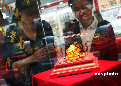 4月7日,由北京奧組委授權(quán)發(fā)行的“北京奧運徽寶黃金珍藏版”在北京王府井熱銷!氨本⿰W運徽寶黃金珍藏版”全球限量發(fā)行5000方,每方售價為人民幣18.8萬元,其主體是以500克千足金為質(zhì)材的印章,由精雕細(xì)琢的硬木漆紅嵌銀絲寶盒包藏。 鄭雄增 攝