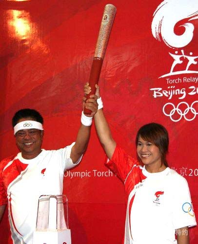 4月17日,泰國奧委會主席育塔薩先生在泰國國家體育館就奧運火炬?zhèn)鬟f活動舉行新聞發(fā)布會上表示,曼谷為迎接北京奧運會圣火已經(jīng)做好一切準(zhǔn)備。圖為北京奧運會火炬?zhèn)鬟f泰國站第一位火炬手曼谷市政府副次長阿南(左)和最后一位火炬手曾獲得奧運會金牌的女子舉重運動員巴維娜(右)。 作者: 顧時宏