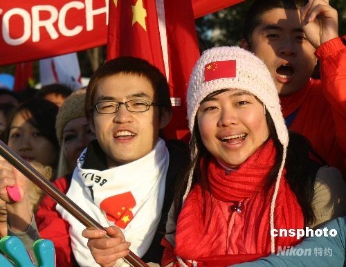 圖為中國(guó)留學(xué)生冒秋寒歡迎奧運(yùn)圣火在堪培拉傳遞。 作者: 沈晨