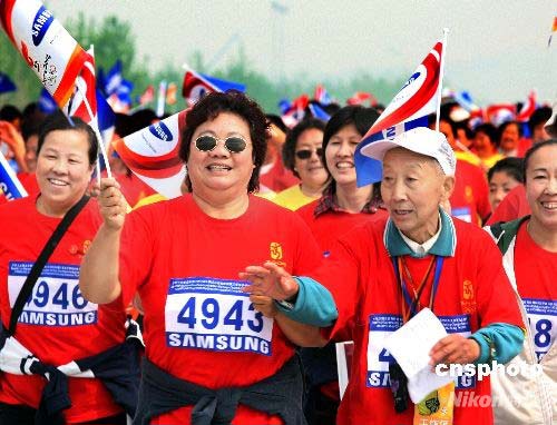 北京奧運(yùn)會(huì)倒計(jì)時(shí)100天群眾馬拉松接力活動(dòng)暨2008年北京國(guó)際長(zhǎng)跑節(jié),4月30日上午在北京國(guó)家體育場(chǎng)公共區(qū)隆重舉行。中新社發(fā) 宋吉河 攝