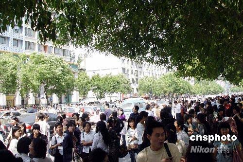 2008年5月12日下午,河南省會(huì)鄭州受到四川地震波及,該市農(nóng)業(yè)路上站滿(mǎn)了疏散的市民。中新社發(fā) 李志全 攝