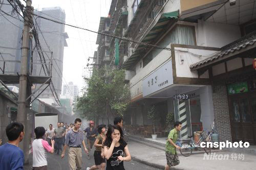 5月12日14時(shí)28分,在四川汶川縣(北緯31度,東經(jīng)103.4度)發(fā)生7.8級地震,四川省會成都有強(qiáng)烈震感,市民緊急從建筑物中跑出來,在街道上緊急避險(xiǎn),全城交通因此受阻。 中新社發(fā) 鄒輝 攝