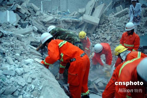 十二日下午兩點三十分左右,受四川汶川地震波及,重慶市梁平縣文化鎮(zhèn)一小學教學樓發(fā)生垮塌,目前已造成五名學生死亡,三十六人受傷。圖為消防隊員正在對被掩埋學生進行搜救。 中新社發(fā) 郭晉嘉 攝