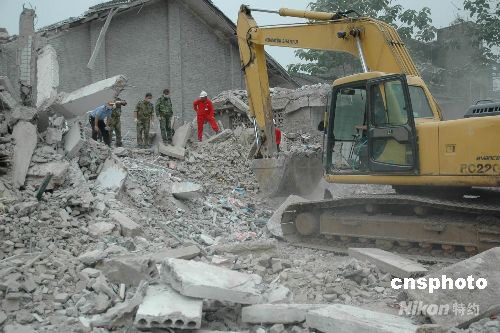 12日下午2:30左右,受四川汶川地震波及,重慶市梁平縣文化鎮(zhèn)一小學(xué)教學(xué)樓發(fā)生垮塌。13日凌晨1時(shí)許,搜救工作已全部結(jié)束,垮塌造成5人死亡,36人受傷。圖為挖掘機(jī)正在垮塌小學(xué)廢墟上進(jìn)行挖掘。 中新社發(fā) 郭虹 攝