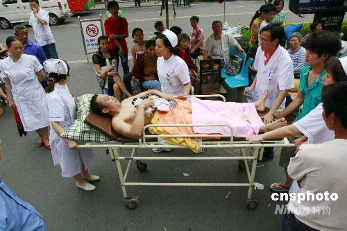 5月12日,四川省遂寧市船山區(qū)人民醫(yī)院將病人疏散到安全地帶繼續(xù)治療。當日14時28分,四川汶川發(fā)生7.8級地震,波及幾百公里之外的遂寧市,時間持續(xù)2分多鐘,造成當?shù)夭糠址课莸顾。截止發(fā)稿之時,人員傷亡情況正在統(tǒng)計之中。目前當?shù)卣呀?jīng)啟動緊急預案,城市將人員疏散到安全地帶,群眾情緒穩(wěn)定,社會持續(xù)井然。中新社發(fā) 鐘 敏 攝