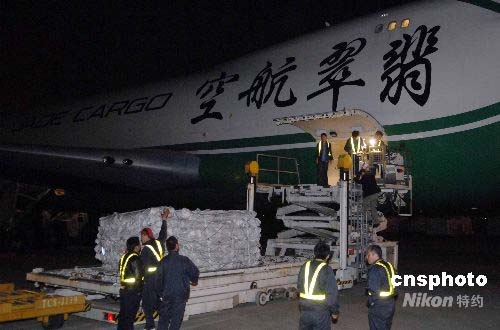 五月十三日深夜,深圳航空旗下的中德合資翡翠航空大型貨機JI7452受命緊急運輸救災物資,四千頂帳篷從天津濱海機場連夜裝機起運,專機運往四川地震災區(qū)。中新社發(fā) 陳文 攝