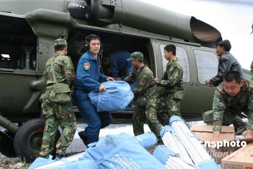 5月14日,成都軍區(qū)某陸航團(tuán)四架直升機(jī)滿(mǎn)載帳篷、礦泉水等災(zāi)區(qū)急需物資抵達(dá)四川大地震震中汶川縣。這是災(zāi)后第一次成功降落到汶川災(zāi)區(qū)的飛機(jī)。圖為解放軍官兵正在分發(fā)救災(zāi)物資。中新社發(fā) 張雷 黃龍 攝