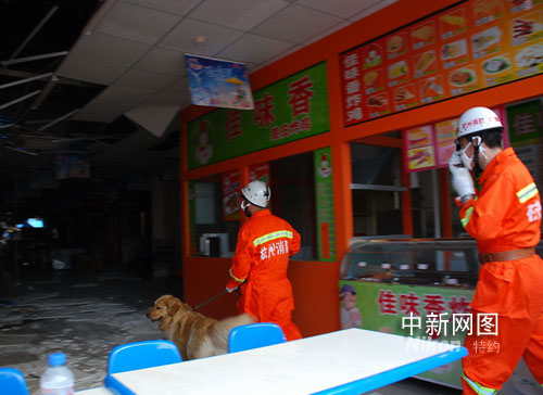 今天,浙江消防搶險(xiǎn)救援隊(duì)進(jìn)行四川地震災(zāi)區(qū)現(xiàn)場,圖為搶險(xiǎn)救援隊(duì)帶領(lǐng)搜救犬進(jìn)入現(xiàn)場搜救。作 者:李玉飛