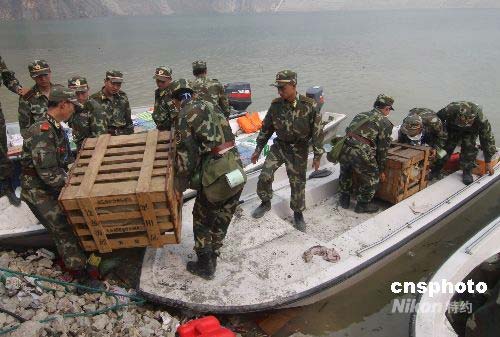解放軍和武警官兵在搬運沖鋒舟上的救災物資。中新社發(fā) 郭國權 攝