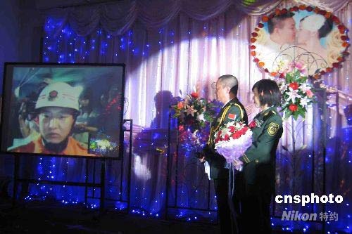 遼寧省遼陽(yáng)市白塔消防大隊(duì)鐵西中隊(duì)副中隊(duì)長(zhǎng)郎猛赴四川抗震救災(zāi),他與陜西省寶雞市扶風(fēng)消防大隊(duì)副指導(dǎo)員常芳的婚禮如期舉行。5月17日,新娘常芳在郎猛的家鄉(xiāng)遼寧省新民市舉行了一場(chǎng)特殊的婚禮。中新社發(fā) 沈殿成 攝