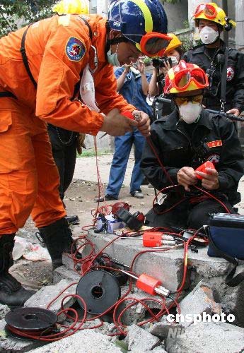 圖為救援隊(duì)在現(xiàn)場調(diào)試裝備。中新社發(fā) 齊彬 攝
