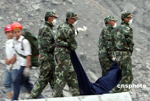 通往四川省汶川地震核心重災(zāi)區(qū)映秀鎮(zhèn)的簡易公路5月17日打通后,各路專業(yè)救援隊(duì)繼續(xù)在廢墟中尋找可能的幸存者,部分解放軍與武警士兵則負(fù)責(zé)安置遇難者的遺體,以防止發(fā)生疫情。中新社發(fā) 任晨鳴 攝