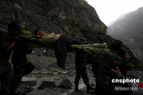 成都軍區(qū)駐渝某集團(tuán)軍紅軍師步兵團(tuán)翻山越嶺解救汶川大地震茂縣羌寨兩位女傷員,傍晚成功送到前來支援的解放軍第二軍醫(yī)大學(xué)醫(yī)療隊(duì)。中新社發(fā) 賈國榮 攝