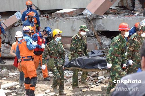 5月18日,日本國(guó)際救援隊(duì)一行二十余人到達(dá)中國(guó)四川北川地震現(xiàn)場(chǎng)——北川中學(xué),利用國(guó)際先進(jìn)的探測(cè)儀器與中國(guó)兩支救援隊(duì)分別挖掘廢墟,救援受難學(xué)生。經(jīng)過共同探測(cè),在沉入地下的樓層內(nèi)發(fā)現(xiàn)有三個(gè)生物體存在,但挖掘極為危險(xiǎn)和困難,生者生命渺茫。中新社發(fā) 鄒憲 攝