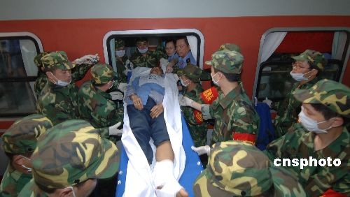 2008年5月19日,按照鐵道部的統(tǒng)一部署,成都鐵路局開行首趟運送地震災區(qū)受傷群眾專列,19日1O:20從綿陽發(fā)車,當日16:57到達重慶北站。運送了206名地震受傷群眾及家屬前往重慶接受治療。該次專列專列車次為57005/6/5次路用傷員列車,編組19輛,全部為25G空調硬臥車。其中硬臥15輛并配備餐車及行李車!
