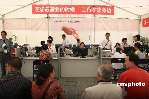 圖為工作人員為客戶提供服務(wù)。中國(guó)工商銀行都江堰支行是災(zāi)區(qū)災(zāi)后第一家全面開展金融業(yè)務(wù)的銀行。