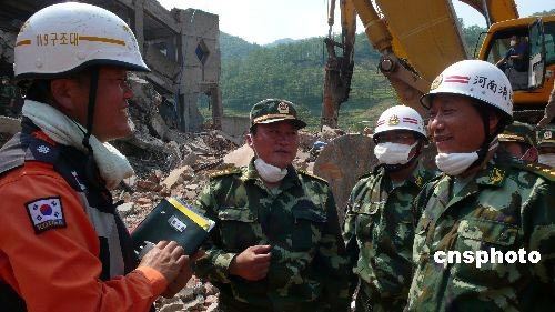 5月19日,中韓兩國救援隊員四川什邡鎣華鎮(zhèn)一處樓房廢墟上,聯手搜救被困者。中新社發(fā) 張曉理 攝