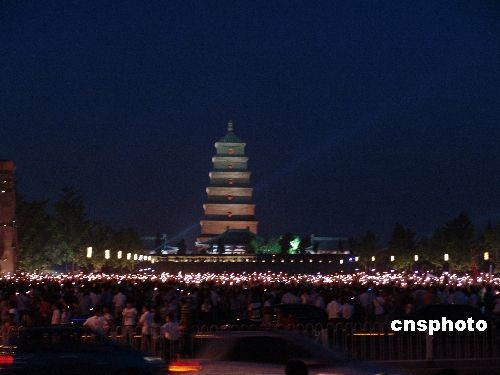 2008年5月19日晚,在西安大雁塔北廣場(chǎng),上萬(wàn)市民手持蠟燭自發(fā)為在汶川大地震中遇難的同胞們致哀。