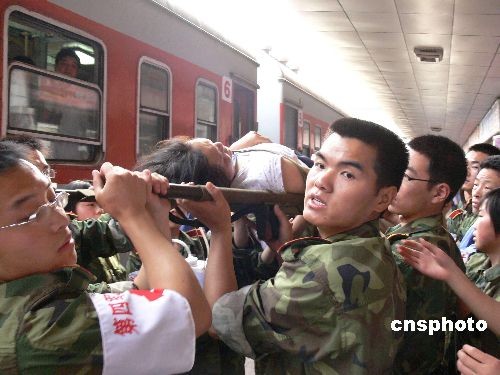 5月21日早7時許,一列運(yùn)送四川地震傷員的專列徐徐駛?cè)胛靼部瓦\(yùn)站,早已等待就緒的醫(yī)務(wù)人員馬上將傷員轉(zhuǎn)送至醫(yī)院接受治療。據(jù)了解,這列運(yùn)送傷員的專列是20日下午4時從四川綿陽發(fā)車的,車上共有傷員248人,車上解放軍第四軍醫(yī)大學(xué)專門抽調(diào)了30余名醫(yī)務(wù)人員全程陪護(hù),到達(dá)西安客運(yùn)站后,傷員將被救護(hù)車全部接到第四軍醫(yī)大學(xué)附屬醫(yī)院西安西京醫(yī)院和唐都醫(yī)院接收治療,目前西京醫(yī)院已經(jīng)提前準(zhǔn)備了500張床位以收治更多的地震傷員。中新社發(fā) 楊志濤 攝