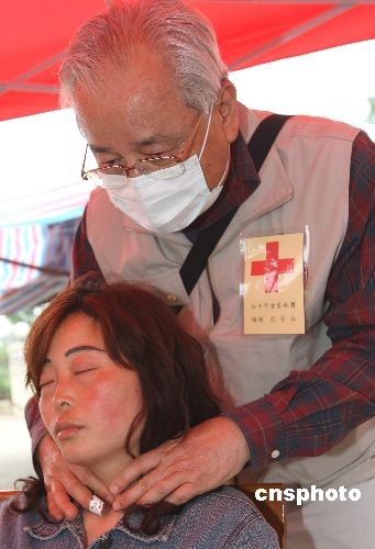 5月21日下午,臺灣紅十字醫(yī)療隊在四川省廣漢市高坪鎮(zhèn)災民安置中心安營扎寨開展醫(yī)療救治。78歲的原臺北市醫(yī)師工會理事長彭芳谷先生在高坪鎮(zhèn)中心醫(yī)院緊急搶救一名在地震中受重傷產(chǎn)生“氣胸”的中年女患者,并指導醫(yī)療隊醫(yī)生為期實施外科手術(shù)。中新社發(fā) 任晨鳴 攝