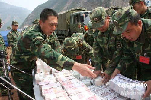 5月22日,第二炮兵某技術總隊政委高海華將620多萬元人民幣金庫庫款、重要資料等清單移交給了綿陽市農村信用聯社負責人陳利雄。四川省北川縣信用聯社八層大樓,是北川縣損壞最嚴重的建筑之一,里面不但埋有多名工作人員,而且還有存放大量資金的國家金庫。5月15日上午,第二炮兵某技術總隊接到任務后,立即組織了由86名專業(yè)技術骨干組成的搜救隊,攜帶挖掘機、切割機、生命探測儀等設備火速趕往該聯社進行被埋人員和金庫庫款的搶救。共營救出9名幸存者,并于21日晚成功搶救出金庫庫款620多萬元和大量寶貴資料。圖為救援人員認真清點現金。中新社發(fā) 陳雙維 攝