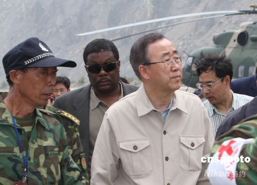 聯(lián)合國(guó)秘書(shū)長(zhǎng)潘基文在映秀鎮(zhèn)察看地震災(zāi)情